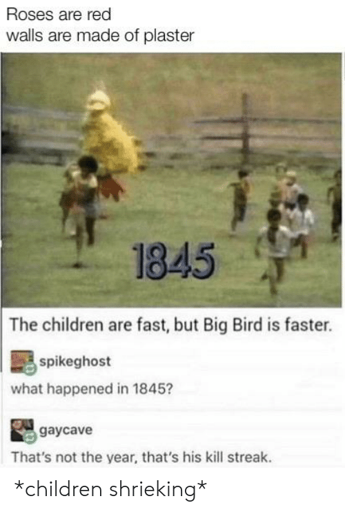 Roses are red walls are made of plaster 1845 The children are fast but Big Bird is faster spikeghost what happened in 1845? gaycave That's not the year that's his kill streak *children shrieking* Meme